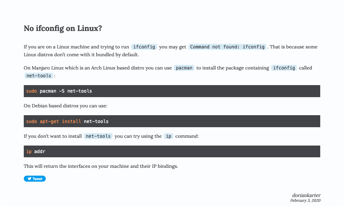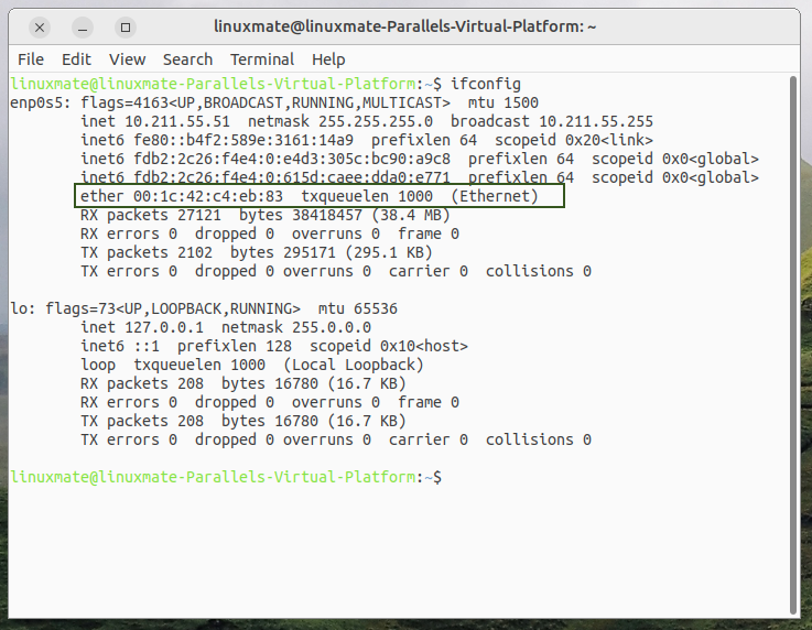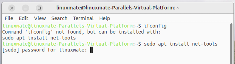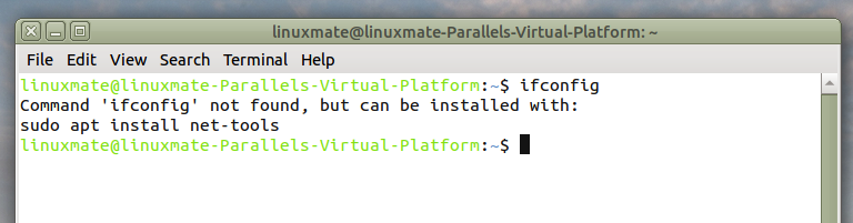 If you see as a result: Command ‘ifconfig’ not found, but can be installed with: sudo apt install net-tools