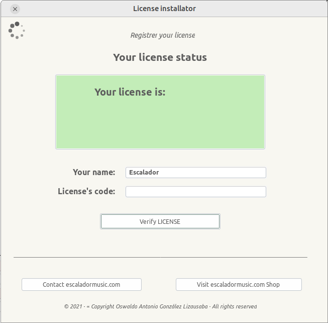 After launching for the first time Escalador, the Installer will ask you to enter your name and the License code.